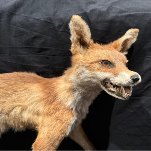 Deze vos heeft een scheur gehad in zijn buik/zijkant. Deze is gerepareerd maar de huid is niet heel stevig op die plek dus deze vos moet zo min mogelijk bewogen worden.