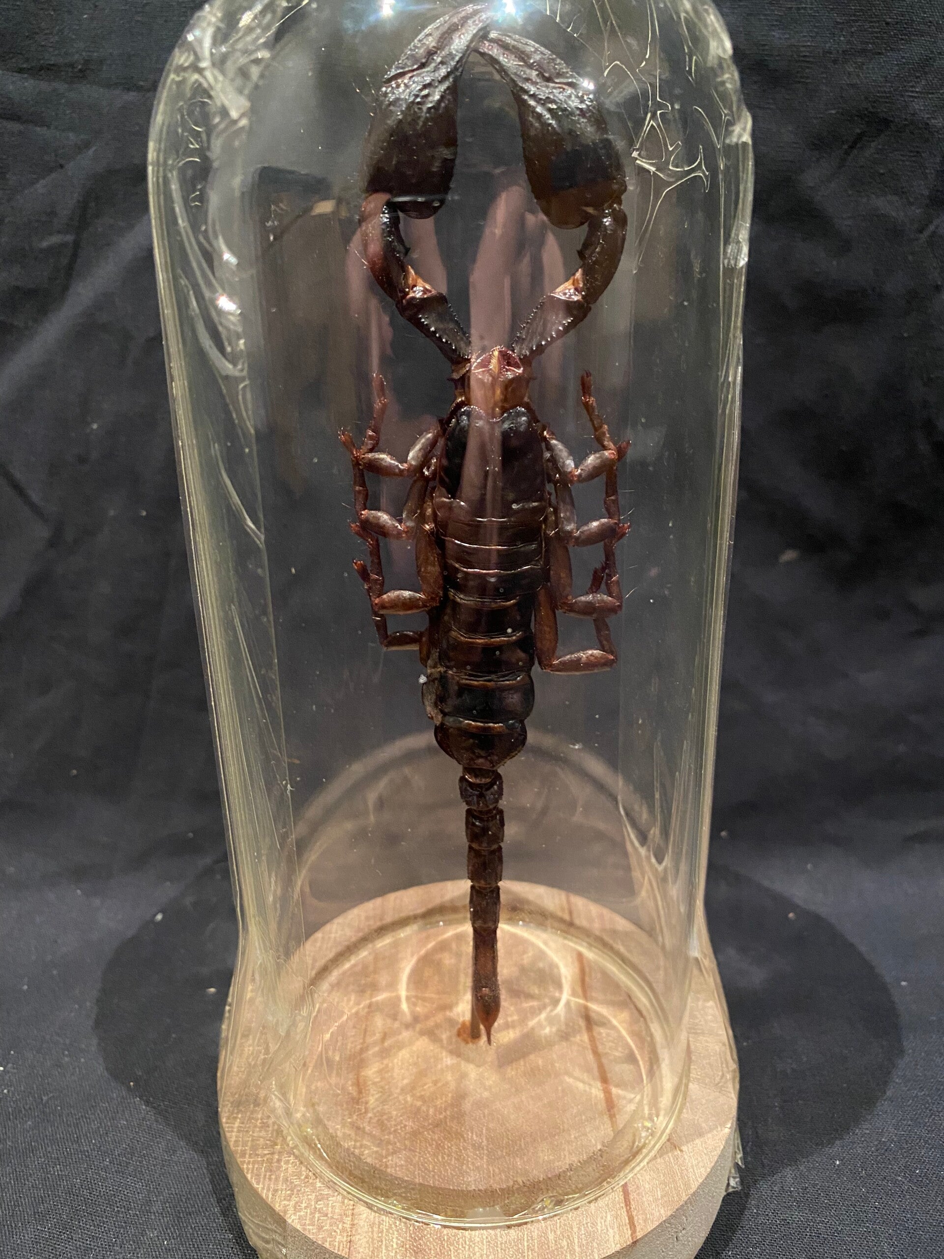 Bos schorpioen in stolp met licht (Heterometrus spinifer)