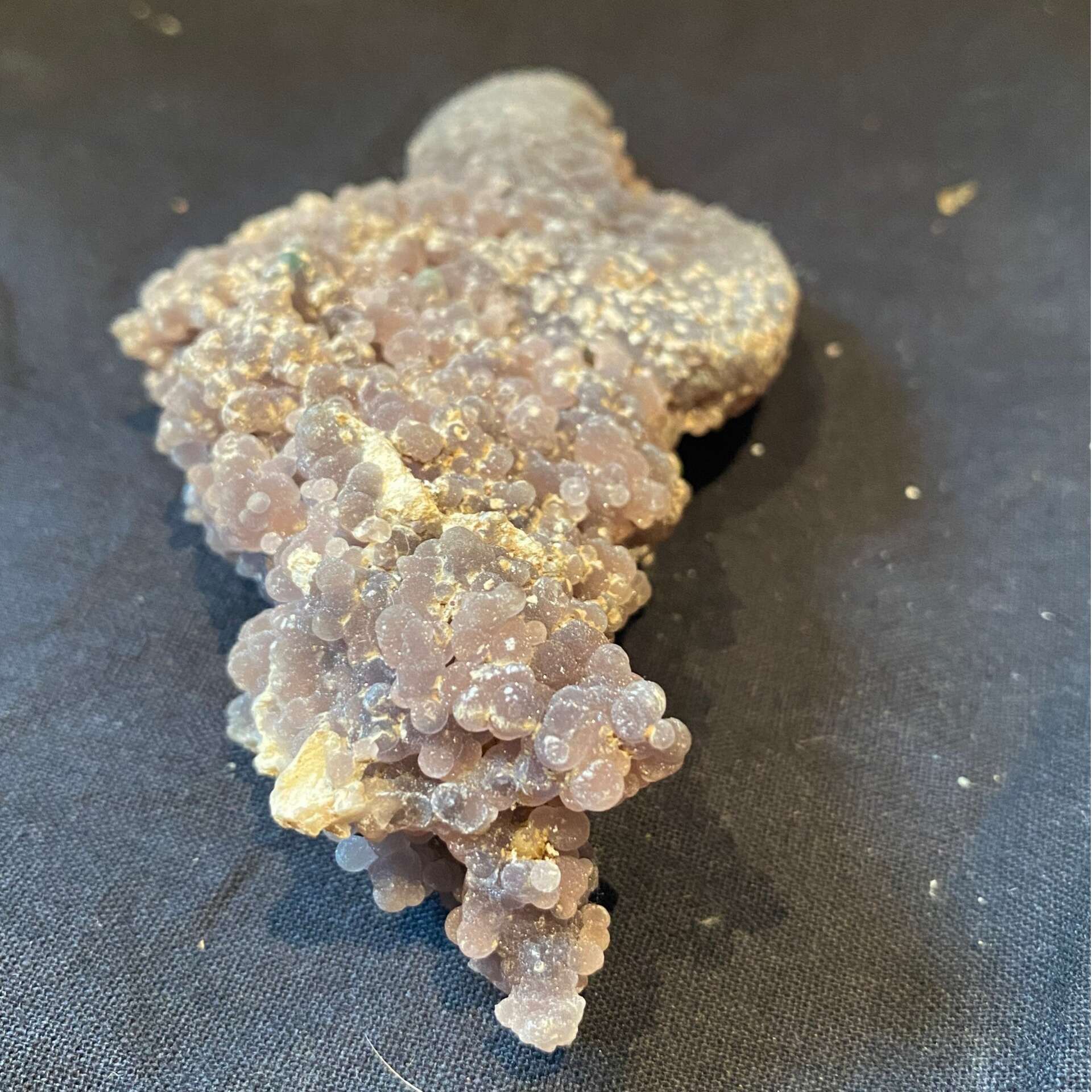 Druivenagaat is een zeldzame en unieke vorm van kwarts die zijn naam ontleent aan de opvallende gelijkenis met een tros druiven. Deze steen heeft bolvormige, ronde knobbeltjes die aan de oppervlakte lijken op kleine druiven, vaak in een paarse, groene of lavendelkleurige tint. Hier is wat belangrijke informatie over druivenagaat: