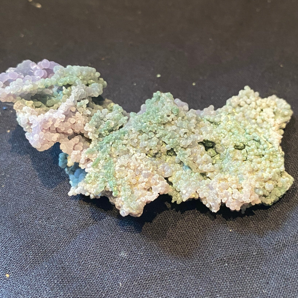 Druivenagaat is een zeldzame en unieke vorm van kwarts die zijn naam ontleent aan de opvallende gelijkenis met een tros druiven. Deze steen heeft bolvormige, ronde knobbeltjes die aan de oppervlakte lijken op kleine druiven, vaak in een paarse, groene of lavendelkleurige tint. Hier is wat belangrijke informatie over druivenagaat: