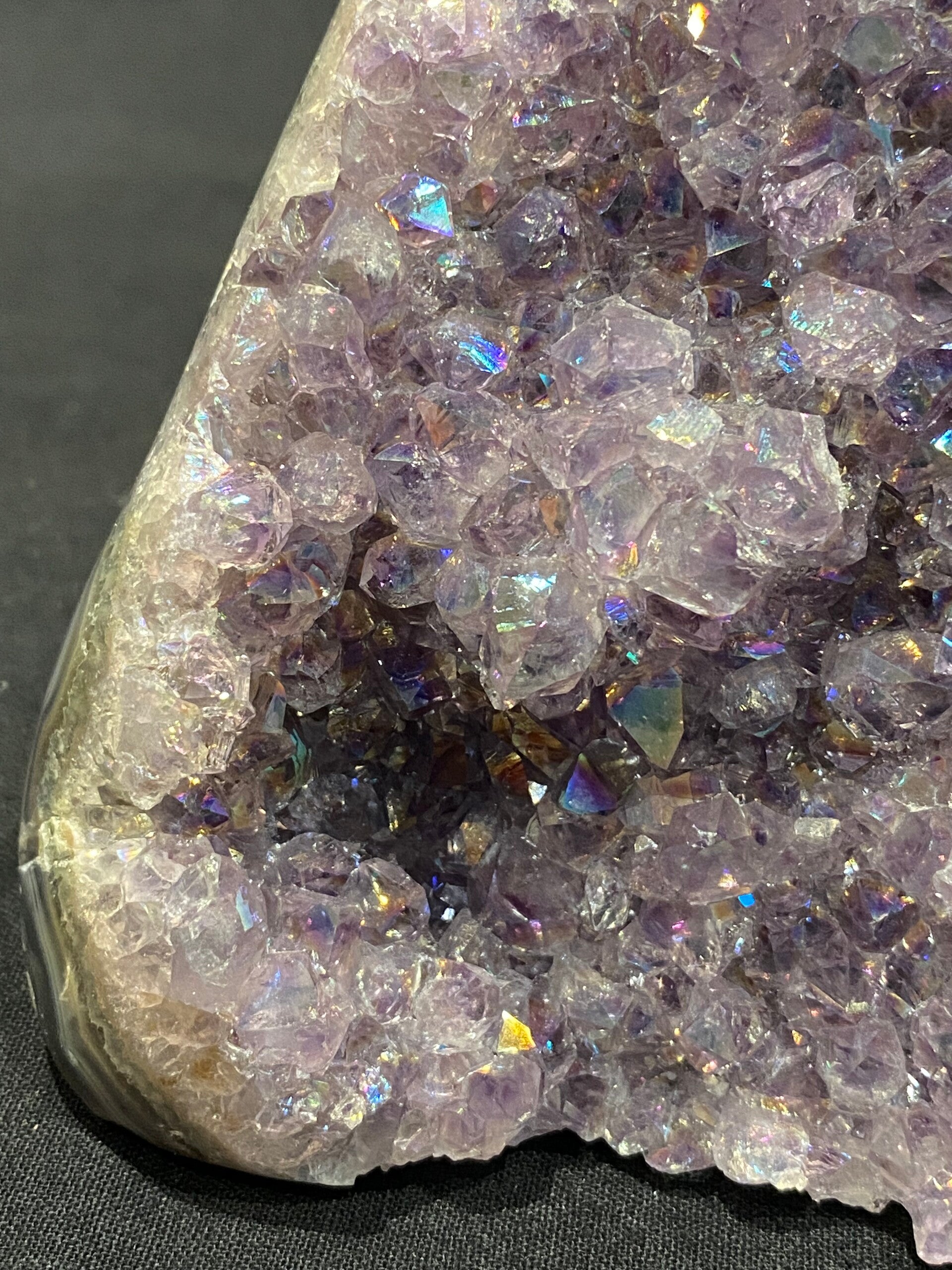 Aura Amethist, ook wel bekend als Angel Aura Amethist of Titanium Aura Amethist, is een behandelde variant van amethist die een iriserende, regenboogachtige glans heeft. Dit effect wordt bereikt door natuurlijke amethist te behandelen met metalen zoals platina, zilver, goud of titanium, waardoor de kristallen een schitterende, etherische uitstraling krijgen.