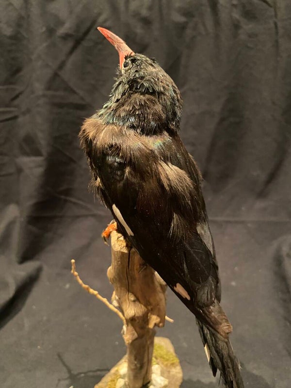 De Groene Kakelaar heeft een vrij unieke uitstraling. De vogel heeft een heldergroene kleur die goed camouflage biedt in het bladerdak van de bomen waar hij vaak voorkomt. De snavel is opvallend helder rood, wat de naam Roodsnavelhop verklaart, en deze felgekleurde snavel is een kenmerk dat niet te missen is. Het hoofd is relatief klein in verhouding tot het lichaam, en de ogen zijn groot, wat zorgt voor een scherpe blik, die handig is bij het zoeken naar voedsel en bij het verkennen van de omgeving.
