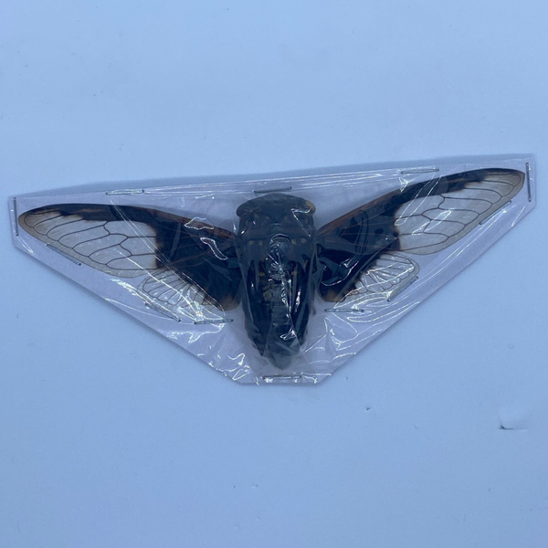 Cicaden staan bekend om hun indrukwekkende levenscyclus: de larven leven jarenlang ondergronds voordat ze tevoorschijn komen, vervellen en als volwassen dier slechts korte tijd bovengronds leven. In opgezette vorm laat Cryptotympana aquila zijn typische vleugelstructuur en krachtige bouw goed zien.