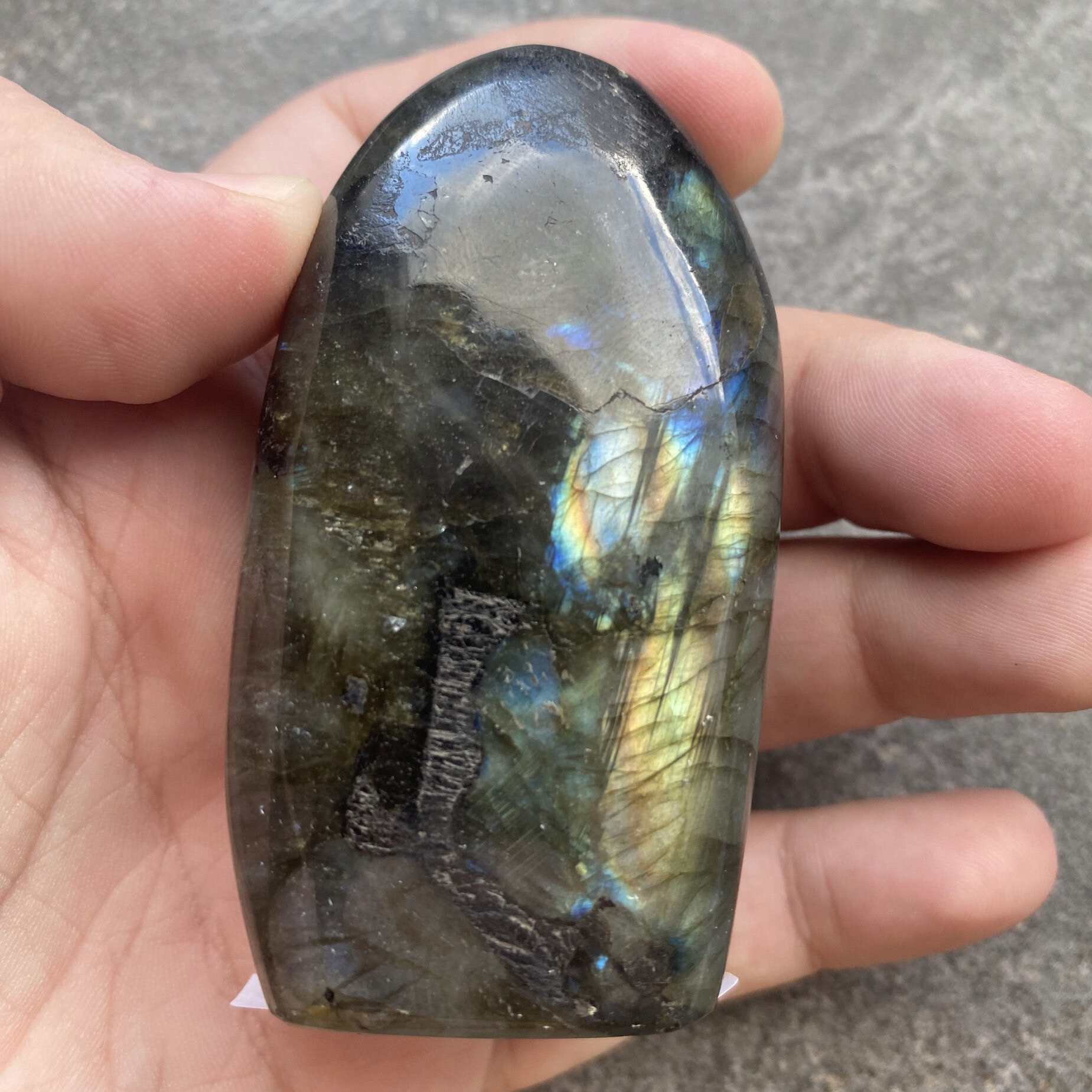 Hardheid: Labradoriet heeft een hardheid van ongeveer 6 tot 6,5 op de schaal van Mohs, wat betekent dat het redelijk hard is maar wel voorzichtig moet worden behandeld om krassen te voorkomen.