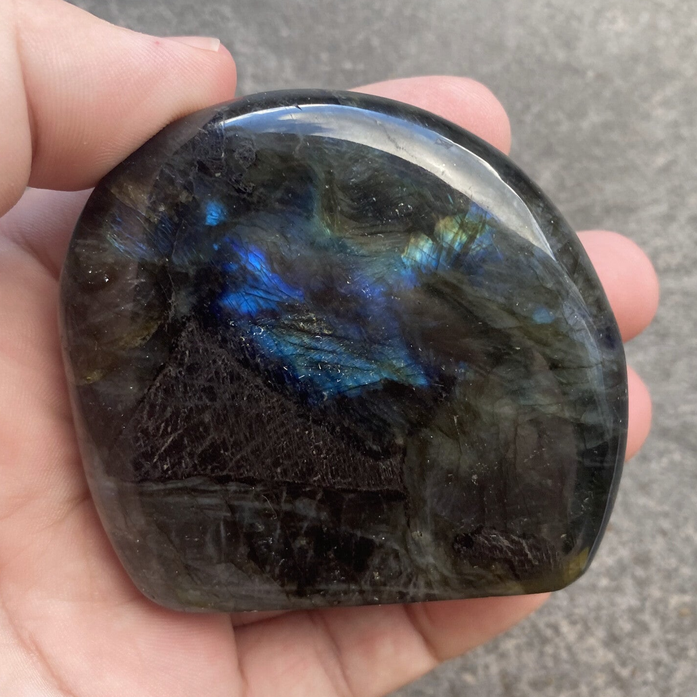 Hardheid: Labradoriet heeft een hardheid van ongeveer 6 tot 6,5 op de schaal van Mohs, wat betekent dat het redelijk hard is maar wel voorzichtig moet worden behandeld om krassen te voorkomen.
