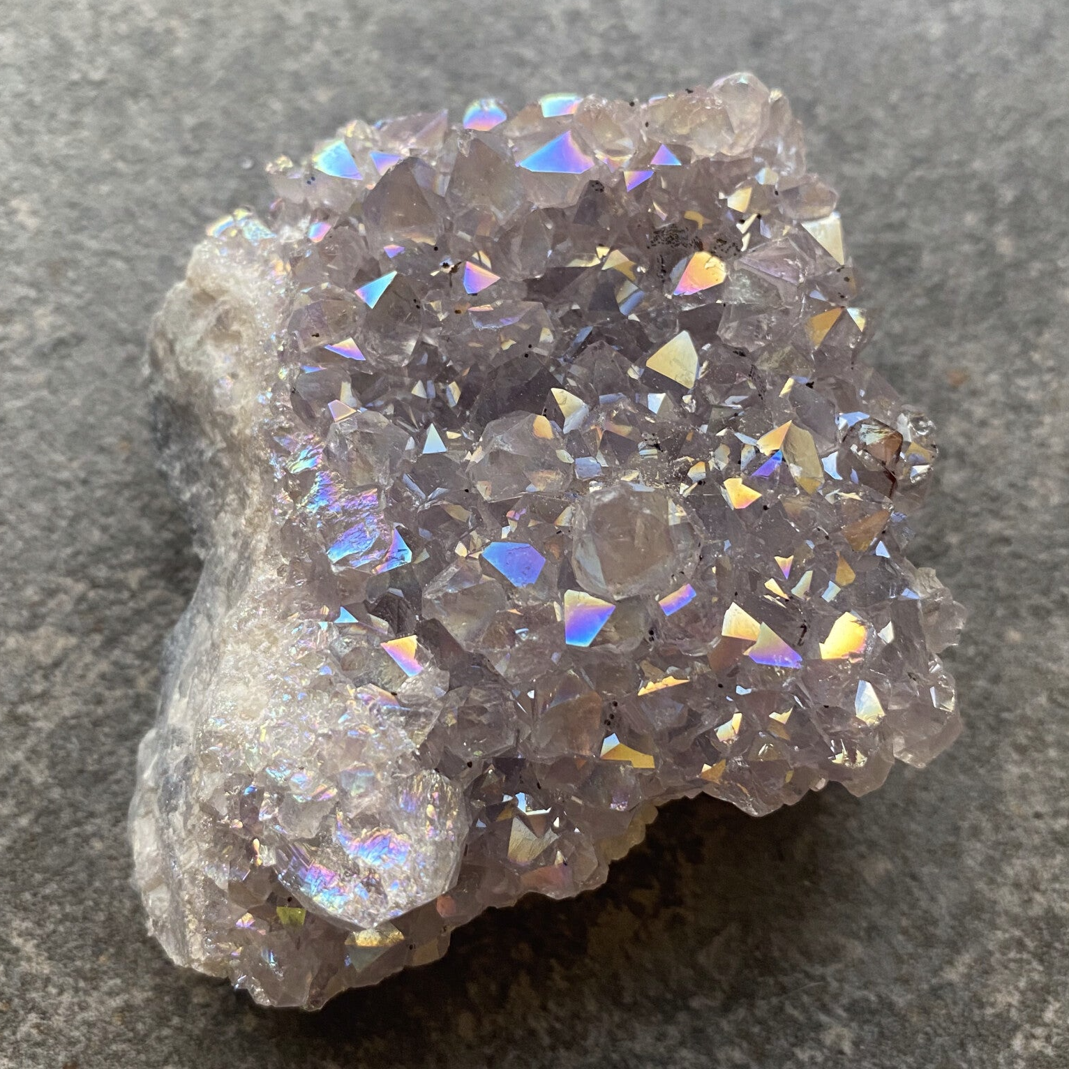 Aura Amethist, ook wel bekend als Angel Aura Amethist of Titanium Aura Amethist, is een behandelde variant van amethist die een iriserende, regenboogachtige glans heeft. Dit effect wordt bereikt door natuurlijke amethist te behandelen met metalen zoals platina, zilver, goud of titanium, waardoor de kristallen een schitterende, etherische uitstraling krijgen.