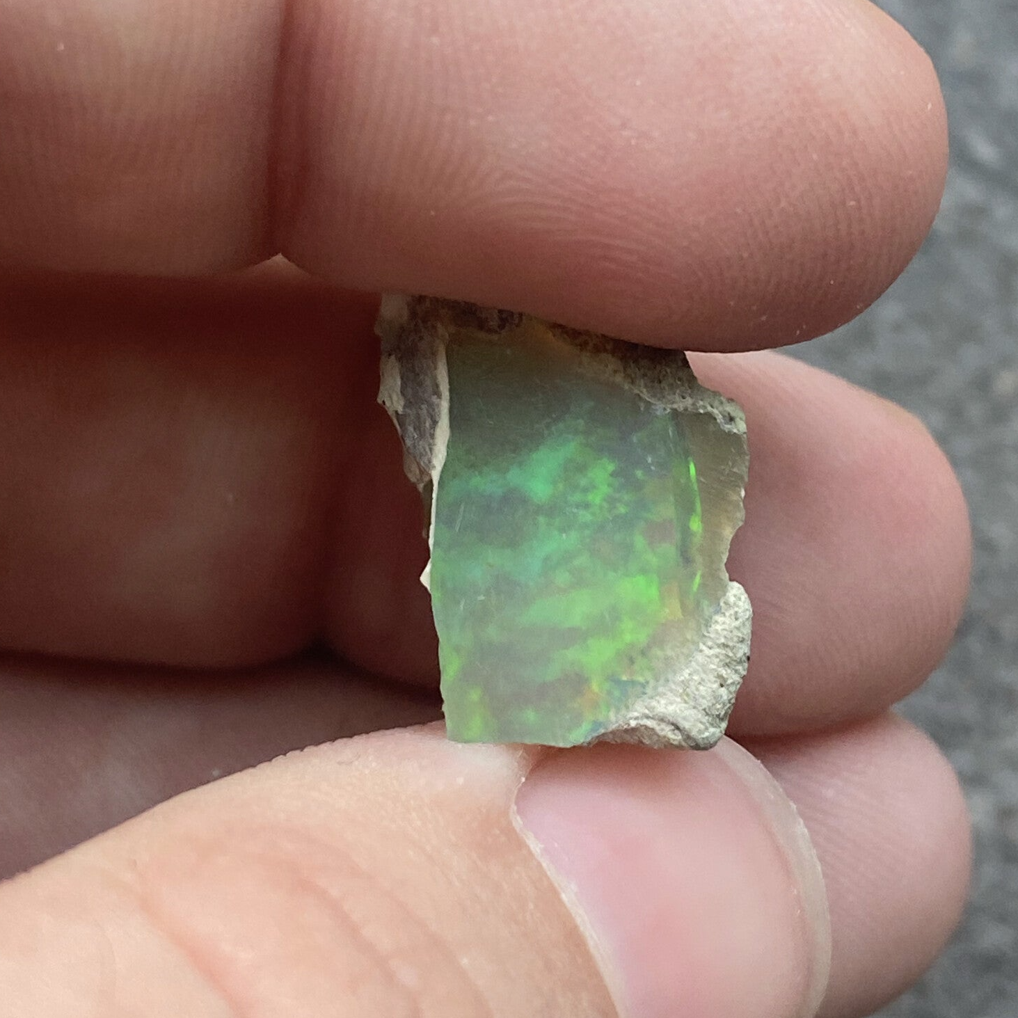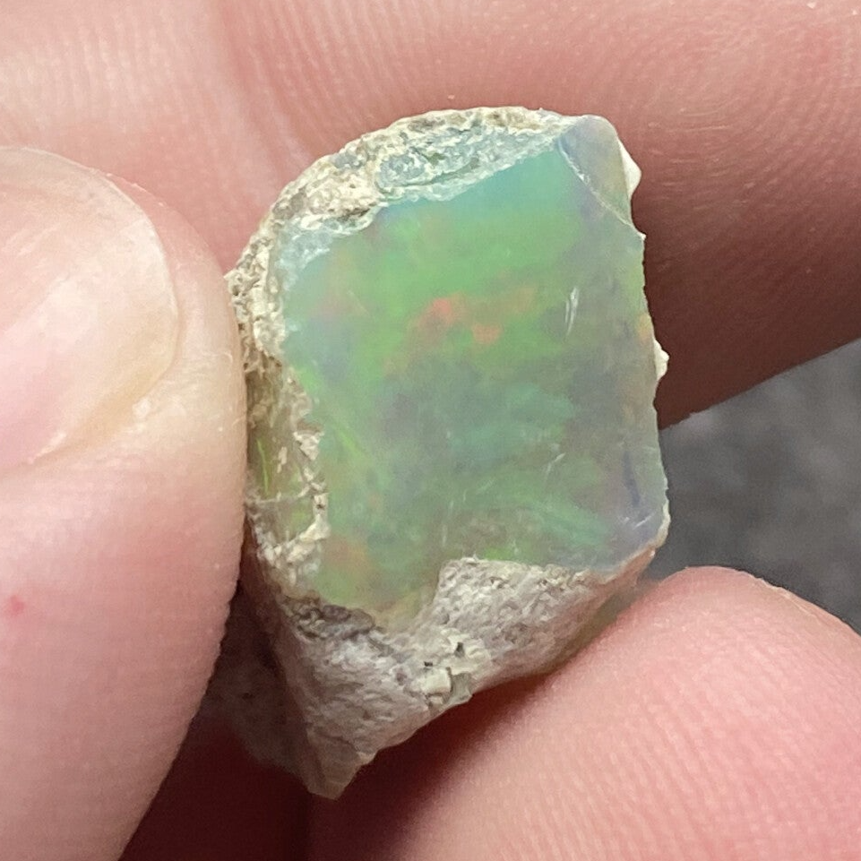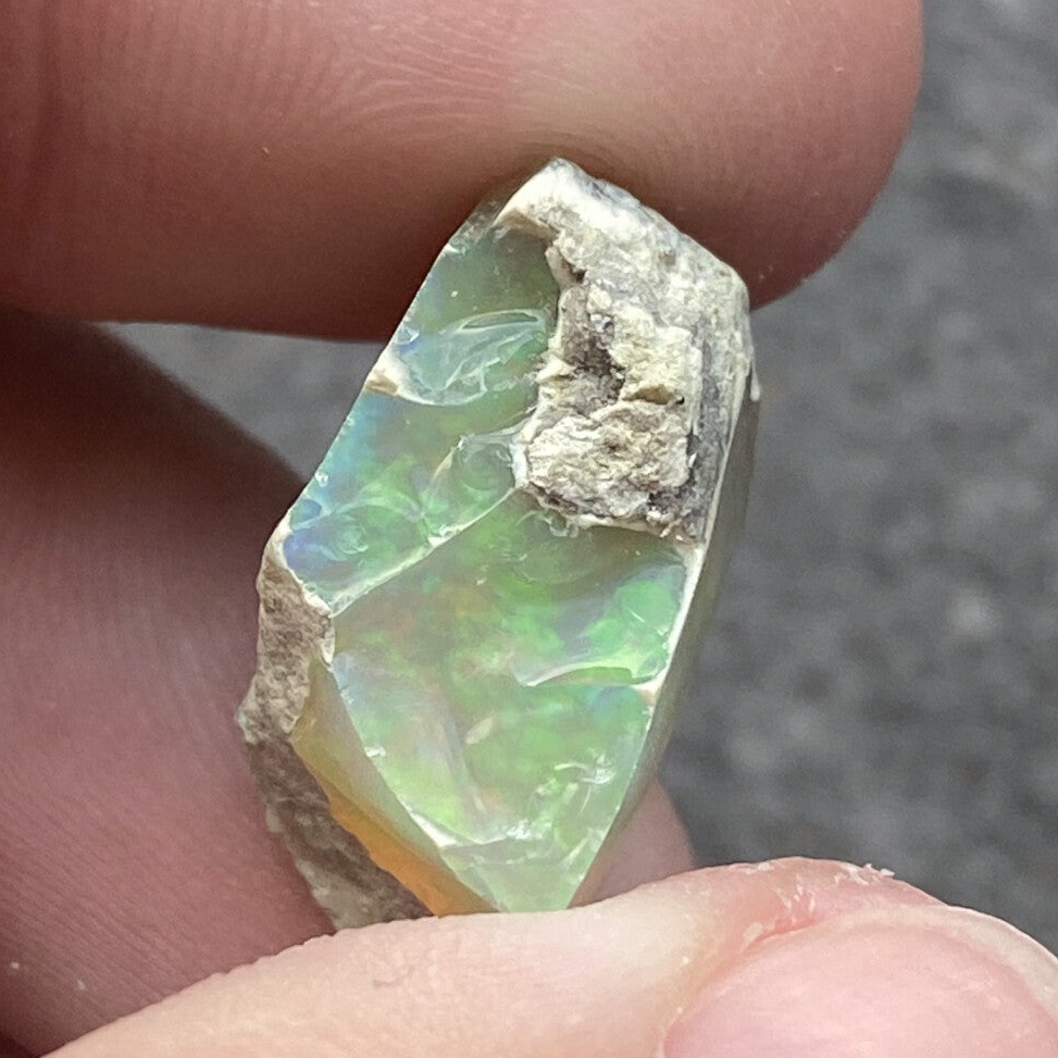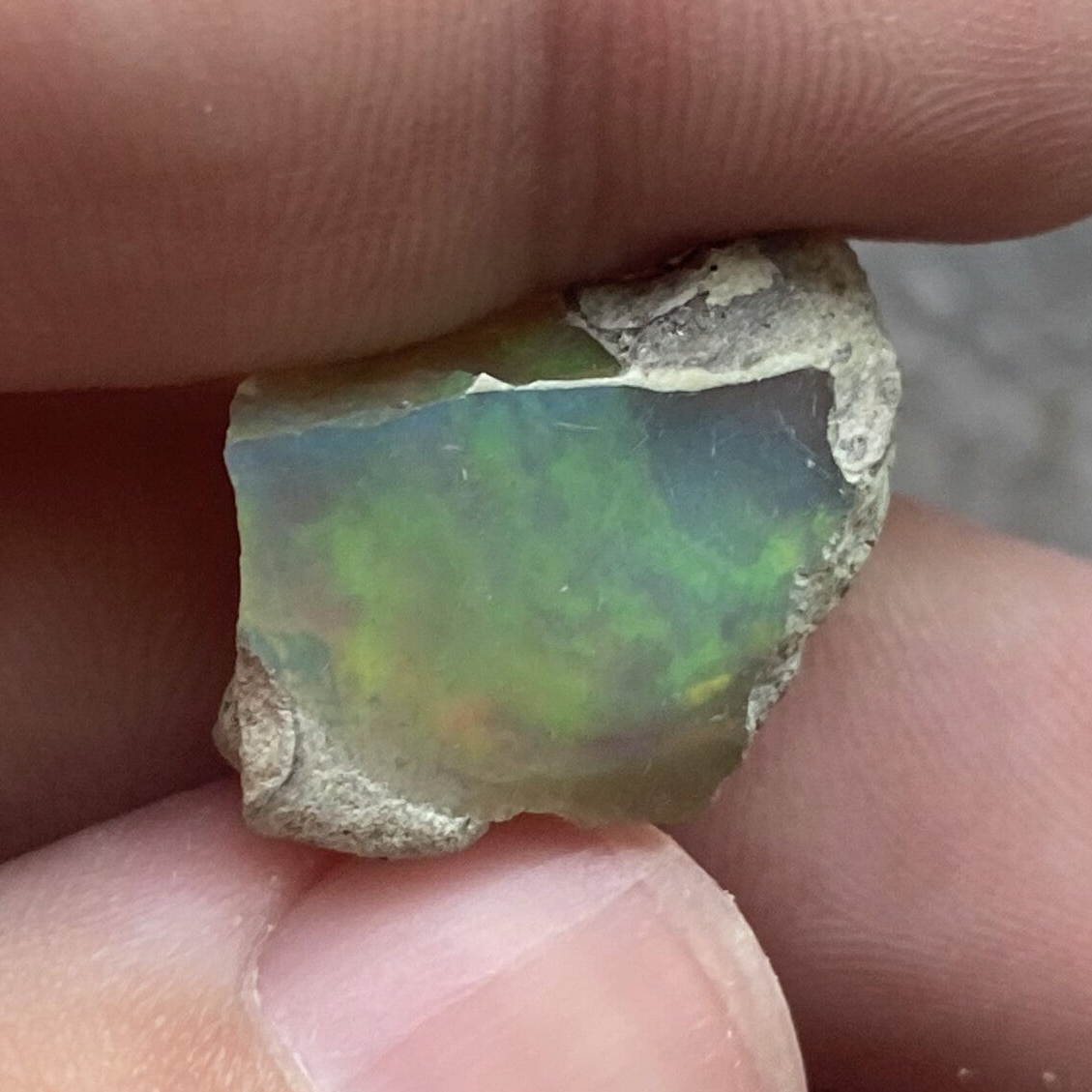 Ruwe Ethiopische opaal is beroemd om zijn levendige spel van kleuren, ook wel opalescentie genoemd. De steen kan doorschijnend tot transparant zijn, met tinten variërend van wit, honingkleurig en oranje tot helder blauwgroen. Wanneer het licht erover valt, vertoont de opaal schitterende flitsen van regenboogkleuren — rood, groen, blauw en paars. Ethiopische opaal wordt vaak gevonden in een ruwe, onregelmatige vorm met een harsachtige glans.