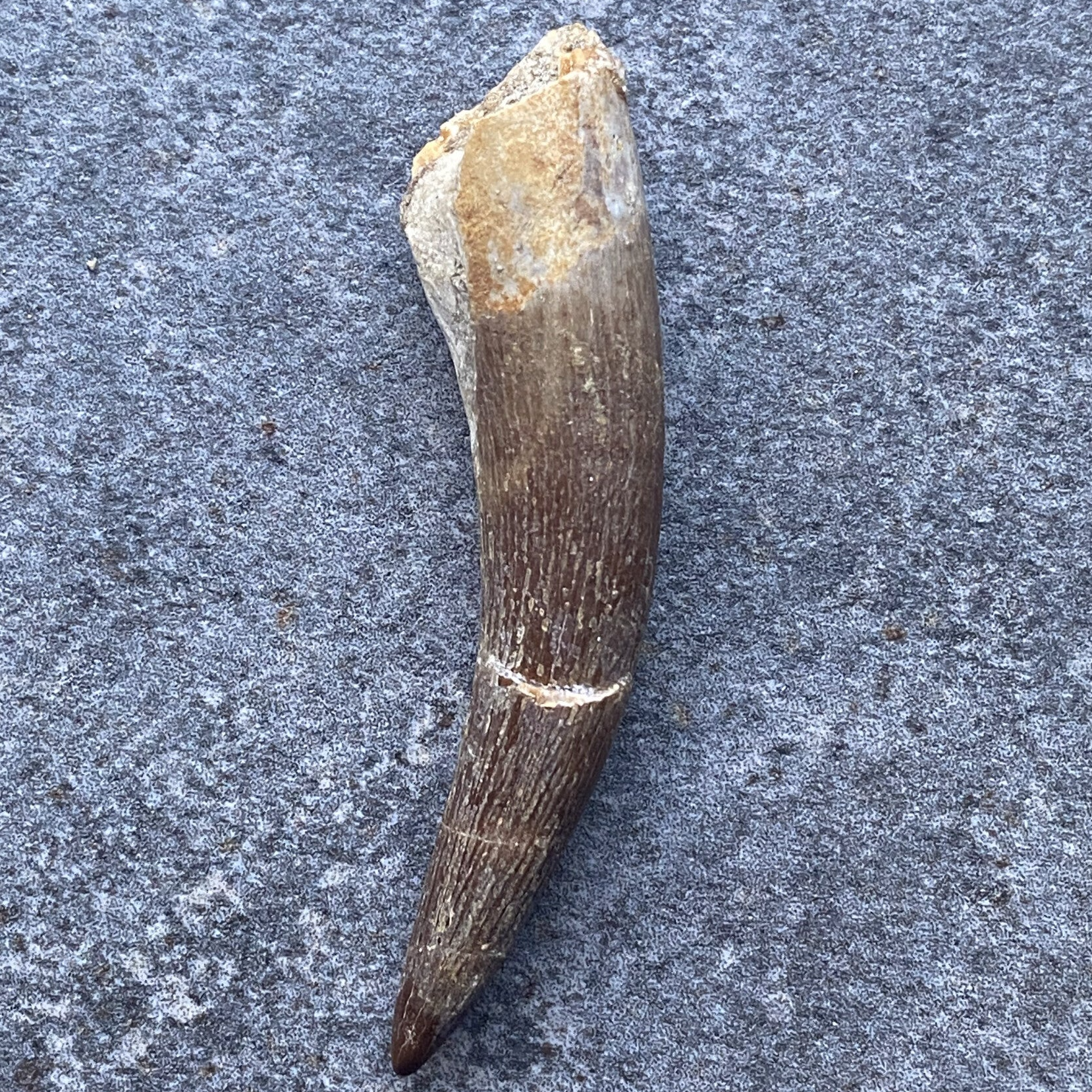 De oorspronkelijke tand bestond uit dentine en glazuur, maar tijdens de fossilisatie is het organisch materiaal vervangen door mineralen zoals calciet, fosfaat en silicaten, waardoor het een steenachtig karakter kreeg.