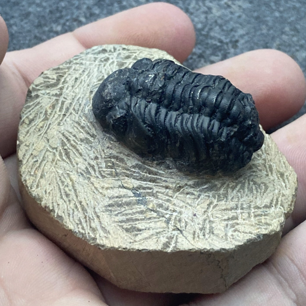 Een compleet trilobietfossiel varieert in kleur van donkergrijs en bruin tot zwart of beige, afhankelijk van de mineralen waarin het is versteend. Het fossiel toont meestal het volledige lichaam, dat bestaat uit drie delen: kop (cephalon), lichaam (thorax) en staart (pygidium). De segmenten en fijne details zoals ogen of pootafdrukken kunnen vaak nog goed zichtbaar zijn. Sommige exemplaren hebben een lichte glans door de mineralen die tijdens de fossilisatie zijn afgezet.