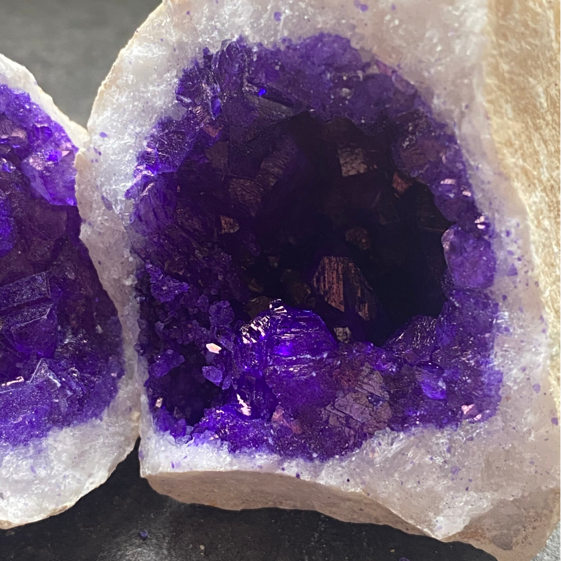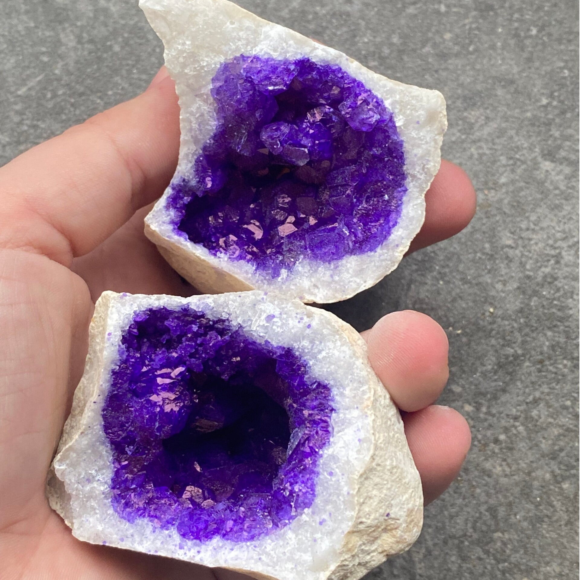 Deze geoden zijn chemisch of thermisch behandeld om de kleur te verkrijgen. De paarse tint komt niet van nature voor in kleurloze kwartskristallen — het is dus belangrijk om onderscheid te maken tussen gekleurde kwartsgeoden en natuurlijke amethistgeoden, die van nature paars zijn.