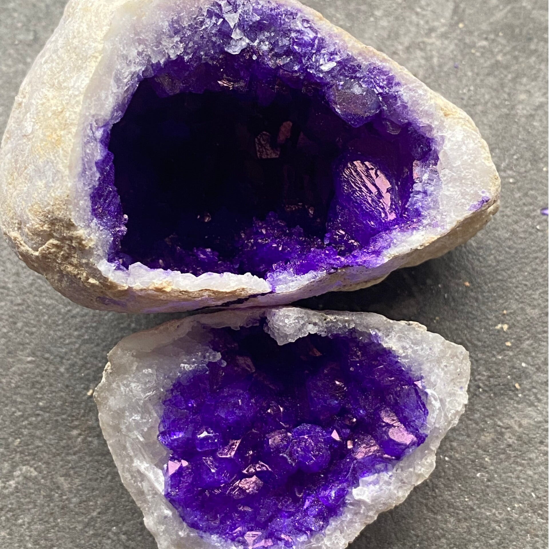 Deze geoden zijn chemisch of thermisch behandeld om de kleur te verkrijgen. De paarse tint komt niet van nature voor in kleurloze kwartskristallen — het is dus belangrijk om onderscheid te maken tussen gekleurde kwartsgeoden en natuurlijke amethistgeoden, die van nature paars zijn.
