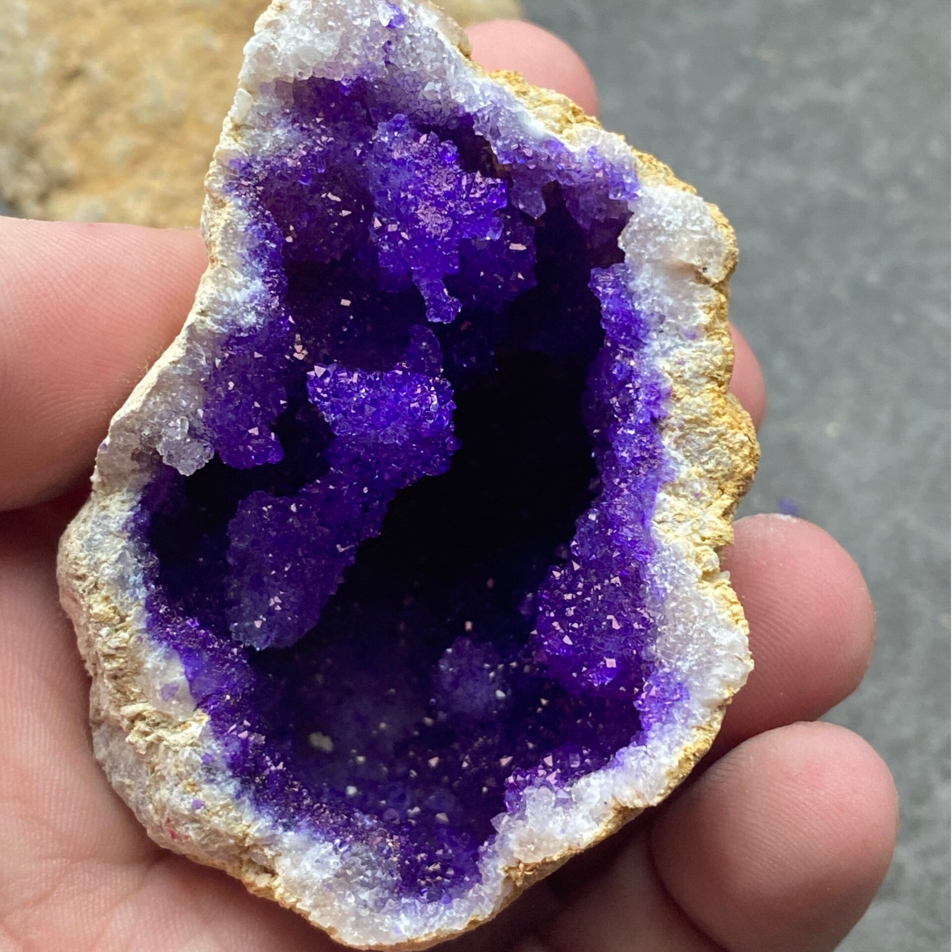 Deze geoden zijn chemisch of thermisch behandeld om de kleur te verkrijgen. De paarse tint komt niet van nature voor in kleurloze kwartskristallen — het is dus belangrijk om onderscheid te maken tussen gekleurde kwartsgeoden en natuurlijke amethistgeoden, die van nature paars zijn.