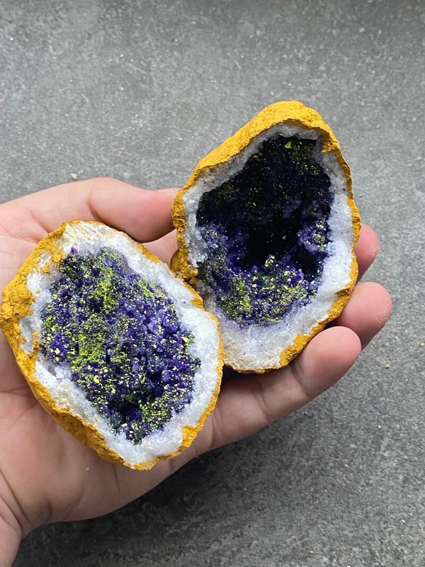 Elke geode is uniek van vorm en kristalstructuur. De behandeling verandert de kleur, maar niet de natuurlijke schoonheid van de kristalvorming binnenin.