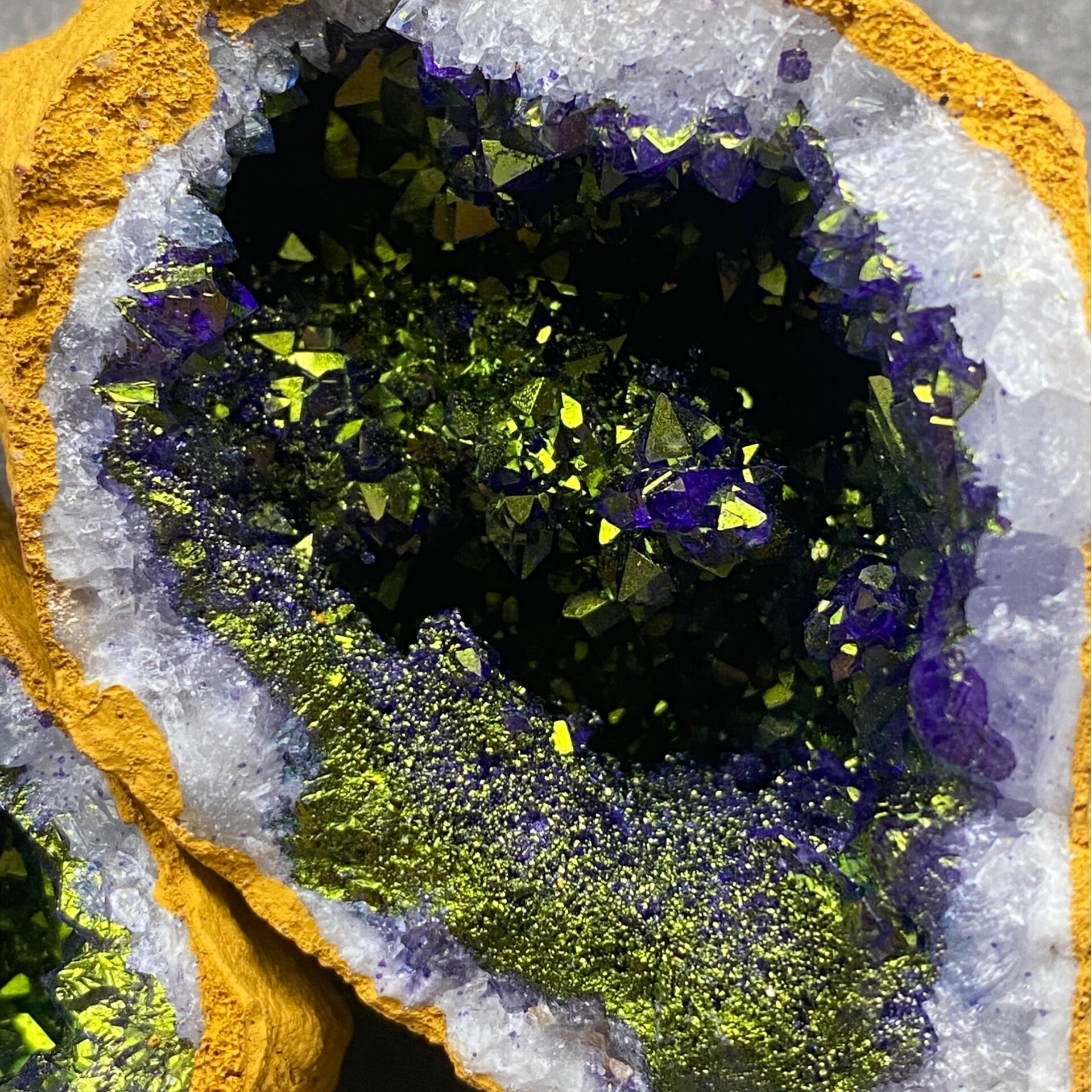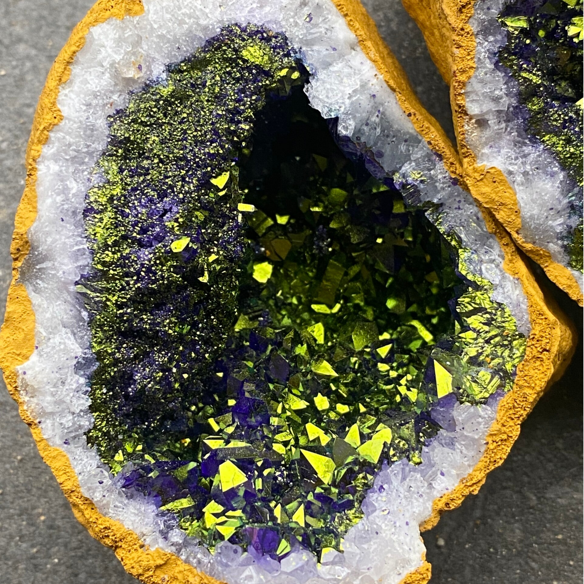 Elke geode is uniek van vorm en kristalstructuur. De behandeling verandert de kleur, maar niet de natuurlijke schoonheid van de kristalvorming binnenin.