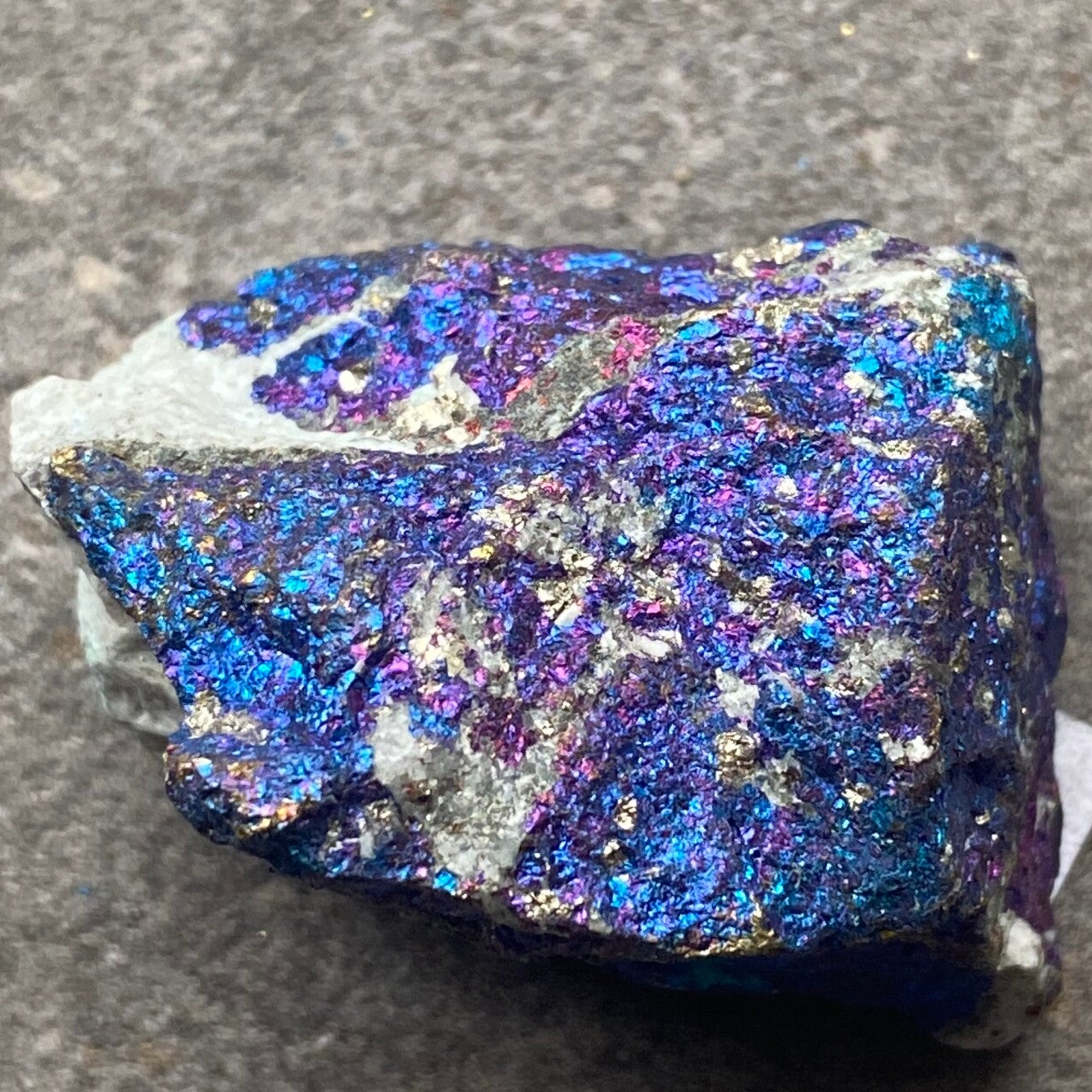De spectaculaire regenboogkleuren van borniet ontstaan niet door kleurstof, maar door oxidatie van het koper aan het oppervlak. Deze natuurlijke reactie met zuurstof geeft borniet zijn kenmerkende iriserende uiterlijk, vergelijkbaar met het effect van olie op water.