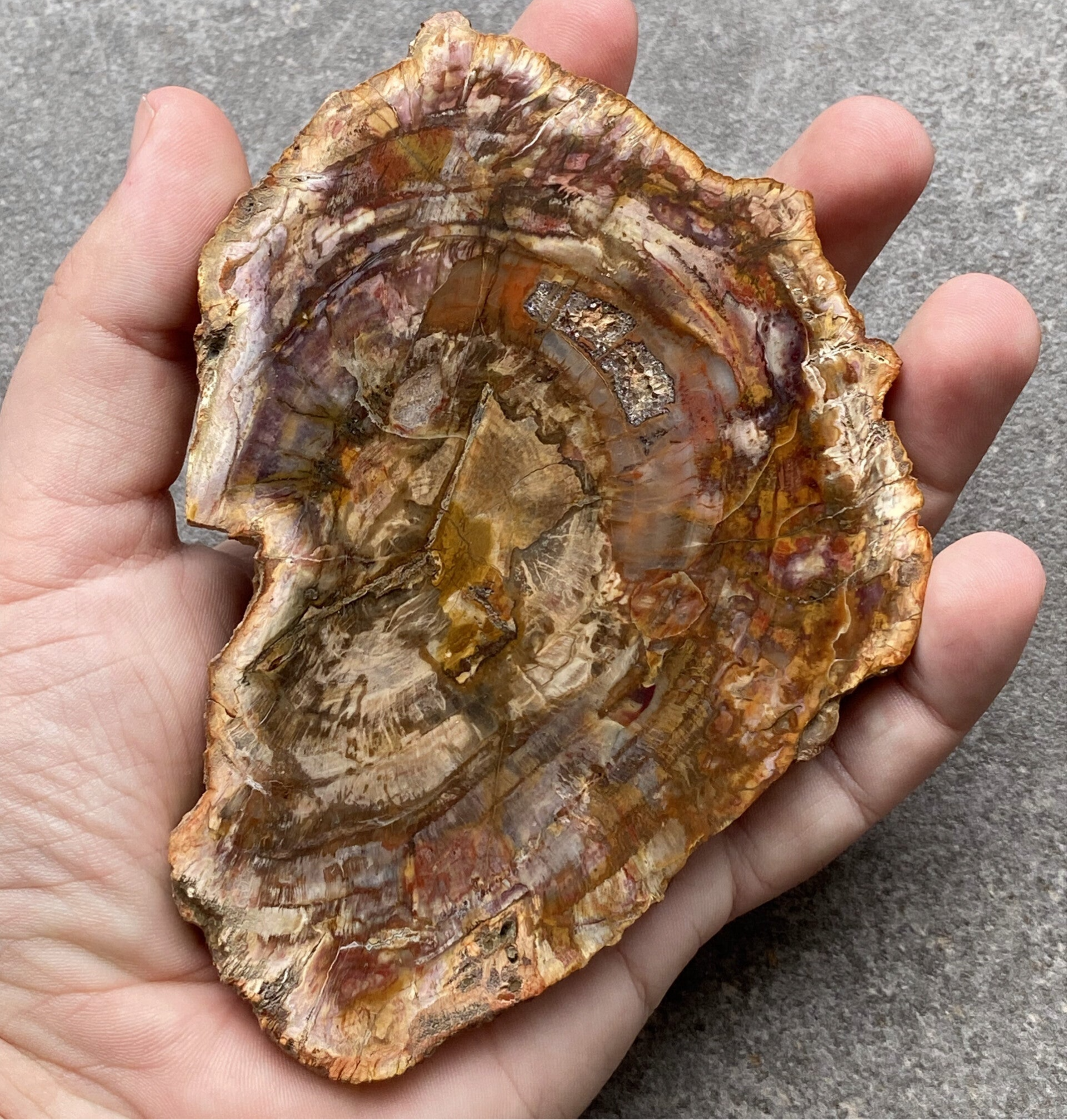 Versteend Hout is ontstaan door silicificatie, waarbij het oorspronkelijke organische hout werd vervangen door siliciumdioxide (SiO₂, kwarts), vaak met sporen van ijzer, mangaan of andere mineralen die kleur geven.