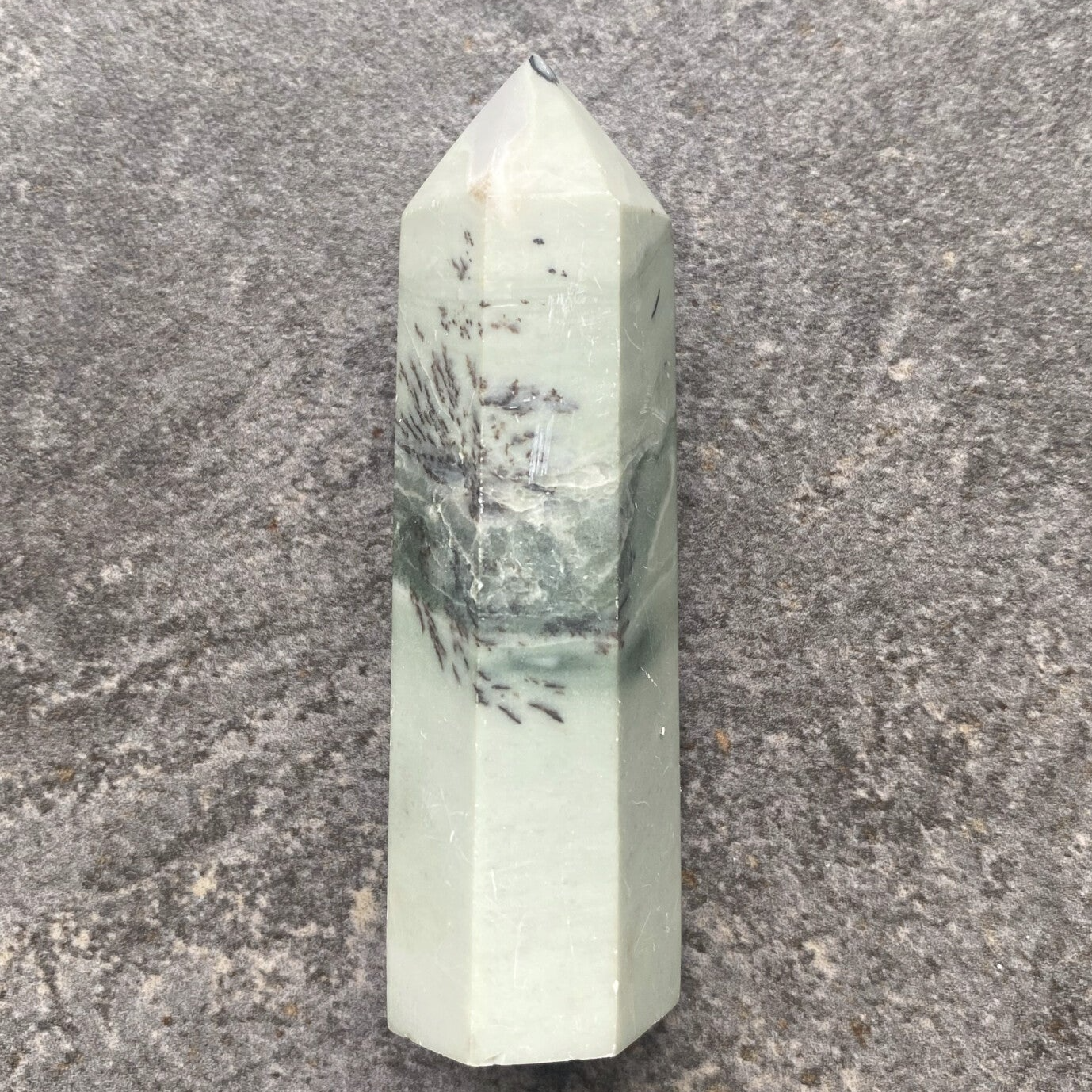 Dendriet Sage Jasper wordt gezien als een steen van rust, stabiliteit en verbinding met de natuur. Spiritueel wordt het geassocieerd met:
