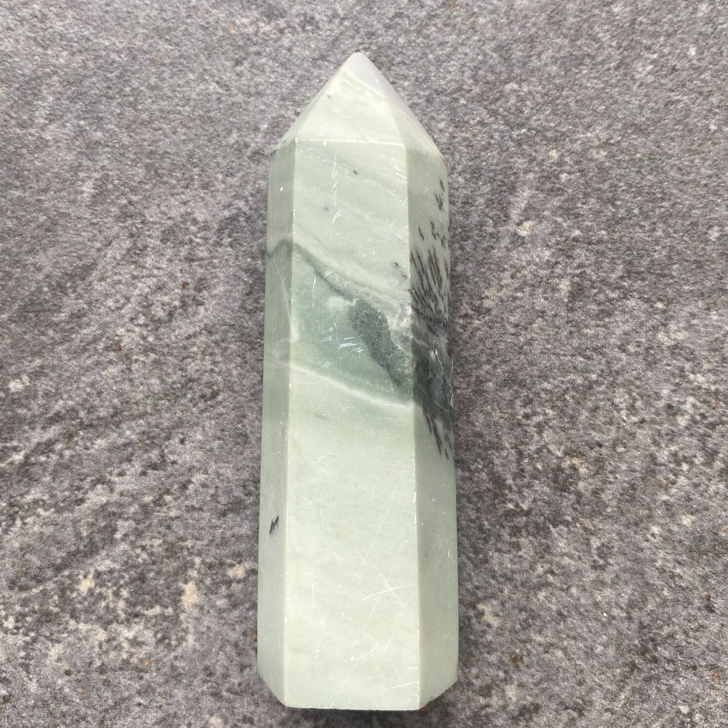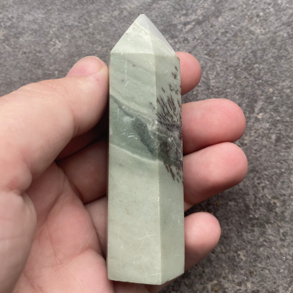 Dendriet Sage Jasper heeft een zacht groen tot grijsgroen basiskleur, vaak met tinten beige, crème, bruin of olijfgroen. Het meest kenmerkend zijn de dendriet- of mosachtige patronen die eruitzien als takjes, worteltjes of varenachtige insluitsels. Deze tekening ontstaat door natuurlijke mineralen zoals mangaan of ijzer die zich door het gesteente verspreiden.