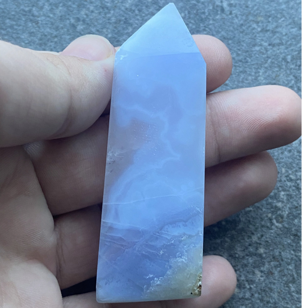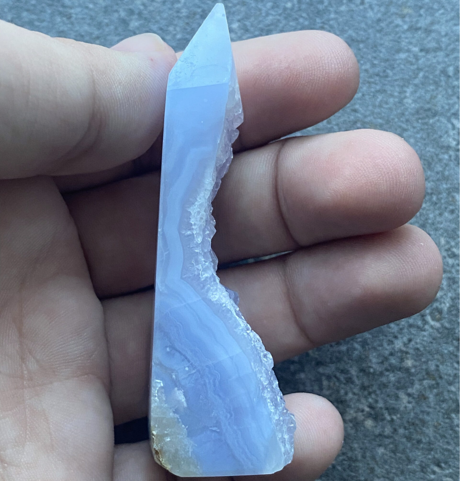 Blue Lace Agate behoort tot de kwartsfamilie en bestaat uit siliciumdioxide (SiO₂). De karakteristieke zachte blauwe kleur en banding zijn het resultaat van microscopische insluitsels van mineralen zoals ijzer en mangaan.